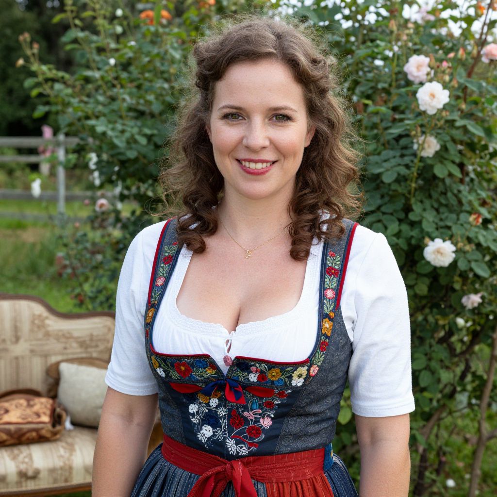 A natural light portrait of a German woman in her early 40s with curly brown hair, friendly smile, and light freckles, dressed in a detailed German costume dress with a embroidered apron and red trim, posing in a countryside garden with blooming roses and vintage German-style furniture in the background. The woman has big tits and cute face