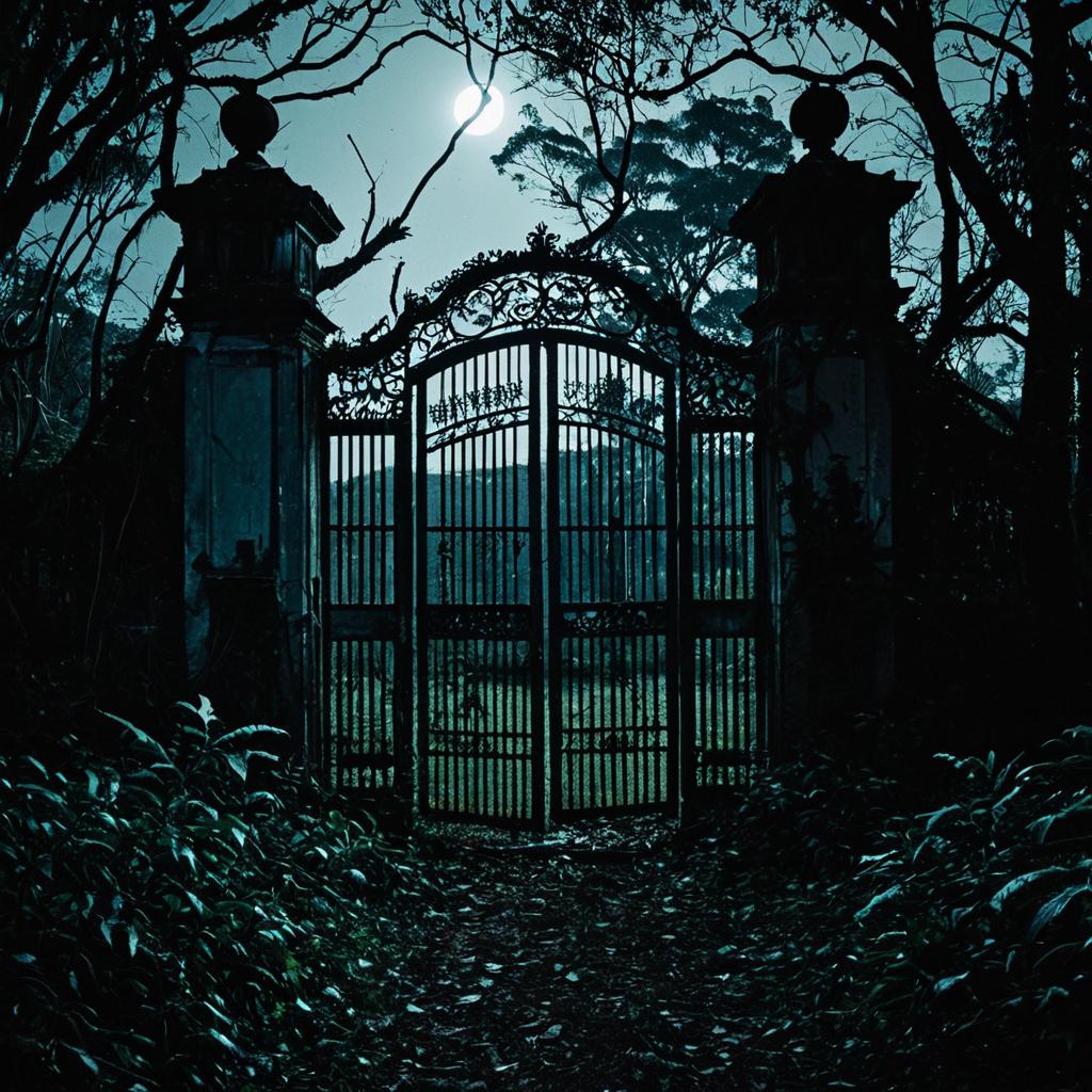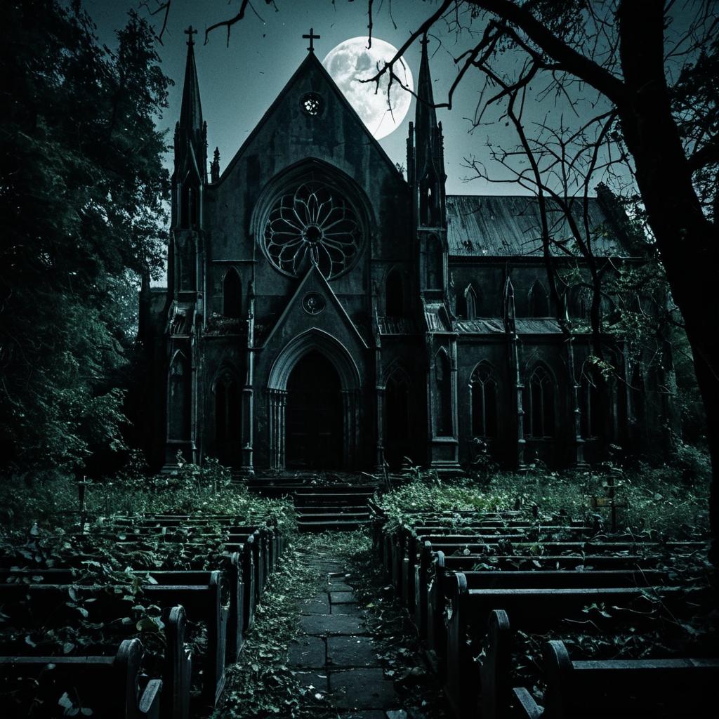 A decaying forgotten cathedral, where the fear of the unknown lurks behind every cracked pew, and the moonlight casts ghostly silhouettes among the thick foliage, evoking a sense of dread and intrigue.
