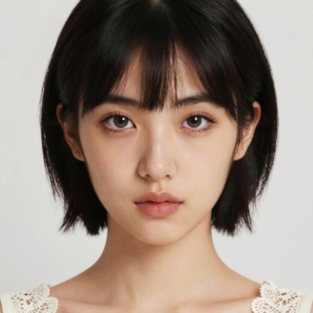 Photograph of an Asian woman with medium-length, slightly messy black hair and soft bangs, gazing directly at the camera with a slightly surprised or thoughtful expression. She has fair skin, large brown eyes, and pink blush on her cheeks. Her lips are slightly parted. She wears a sleeveless white top and has white manicured nails, with her hands gently touching her cheeks. A delicate bracelet with small pearls adorns her right wrist. The background is plain white, making her the focal point. The image has a high-contrast, slightly surreal quality.
