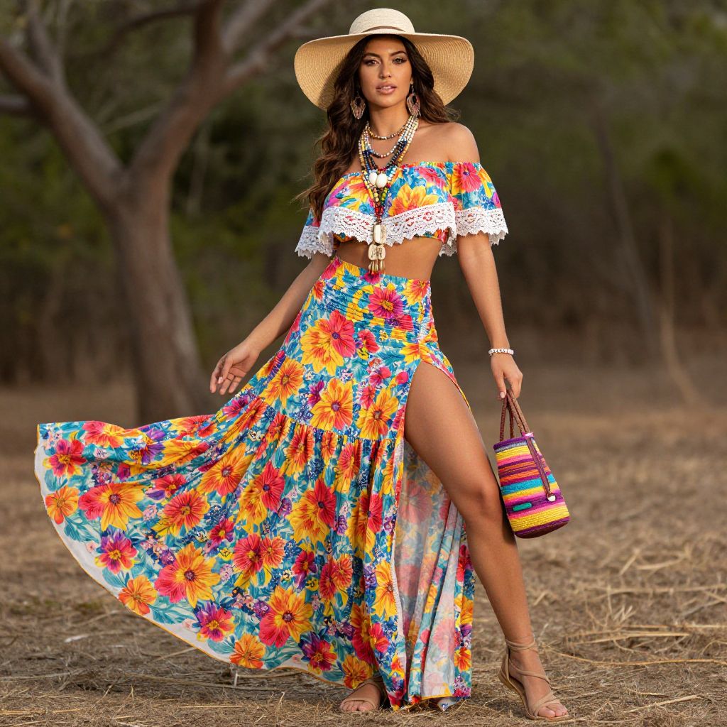 Full body shot, woman, vibrant festival maxi skirt, flowing fabric, bright floral patterns, high-waisted design, lightweight cotton, layered ruffles, matching crop top, off-the-shoulder style, soft jersey material, intricate lace trim, bohemian accessories, wide-brimmed straw hat, chunky beaded necklace, strappy sandals, colorful woven bag, sun-kissed skin, carefree vibe Sexy. Pretty face and beаutiful eyes. Big breasts