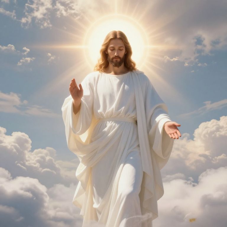 Image Jesus Christ depicted in a serene and ethereal style, glowing with divine light, dressed in flowing white robes, surrounded by a peaceful heavenly landscape with soft clouds and gentle rays of sunlight, conveying compassion and holiness.