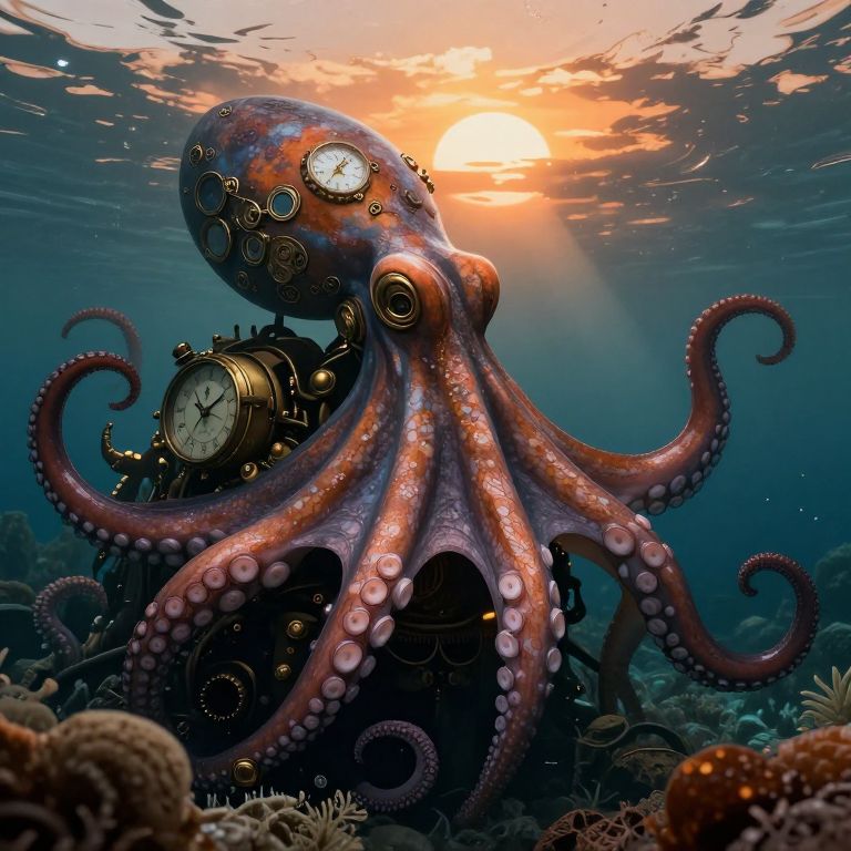Digital art of a steampunk octopus with clock faces on its head, surrounded by coral, underwater at sunset.