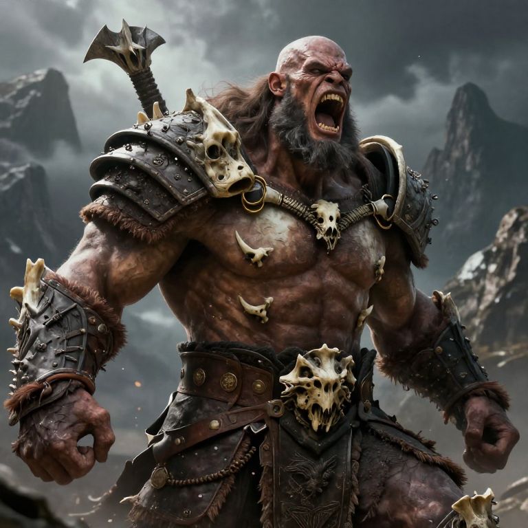 Goliath barbarian art depicting a fierce giant with rugged armor made from bones and leather, roaring fiercely amid a stormy mountain background, raw power and primal fury, high detail, cinematic lighting, fantasy style