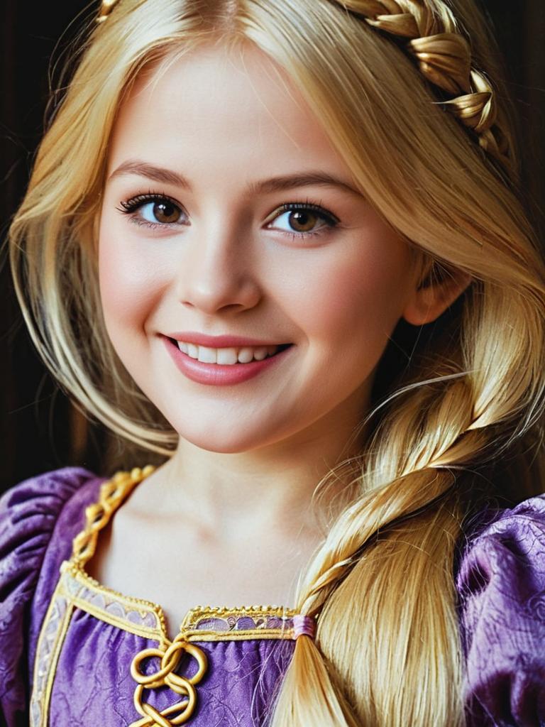 Child in Rapunzel Costume, close-up cheerful headshot, photorealistic realism