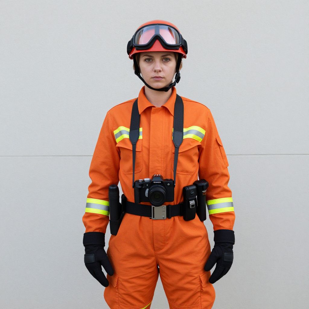 Photograph of a young man standing against a plain white background. He wears an orange firefighter's uniform with yellow reflective stripes on the sleeves and chest, black gloves, and a red helmet with attached goggles. A black utility belt with a camera and other equipment hangs from his waist. His expression is neutral, and he looks directly at the camera. The image is brightly lit, highlighting the vivid colors of his uniform. The overall composition is simple and focused on the subject.