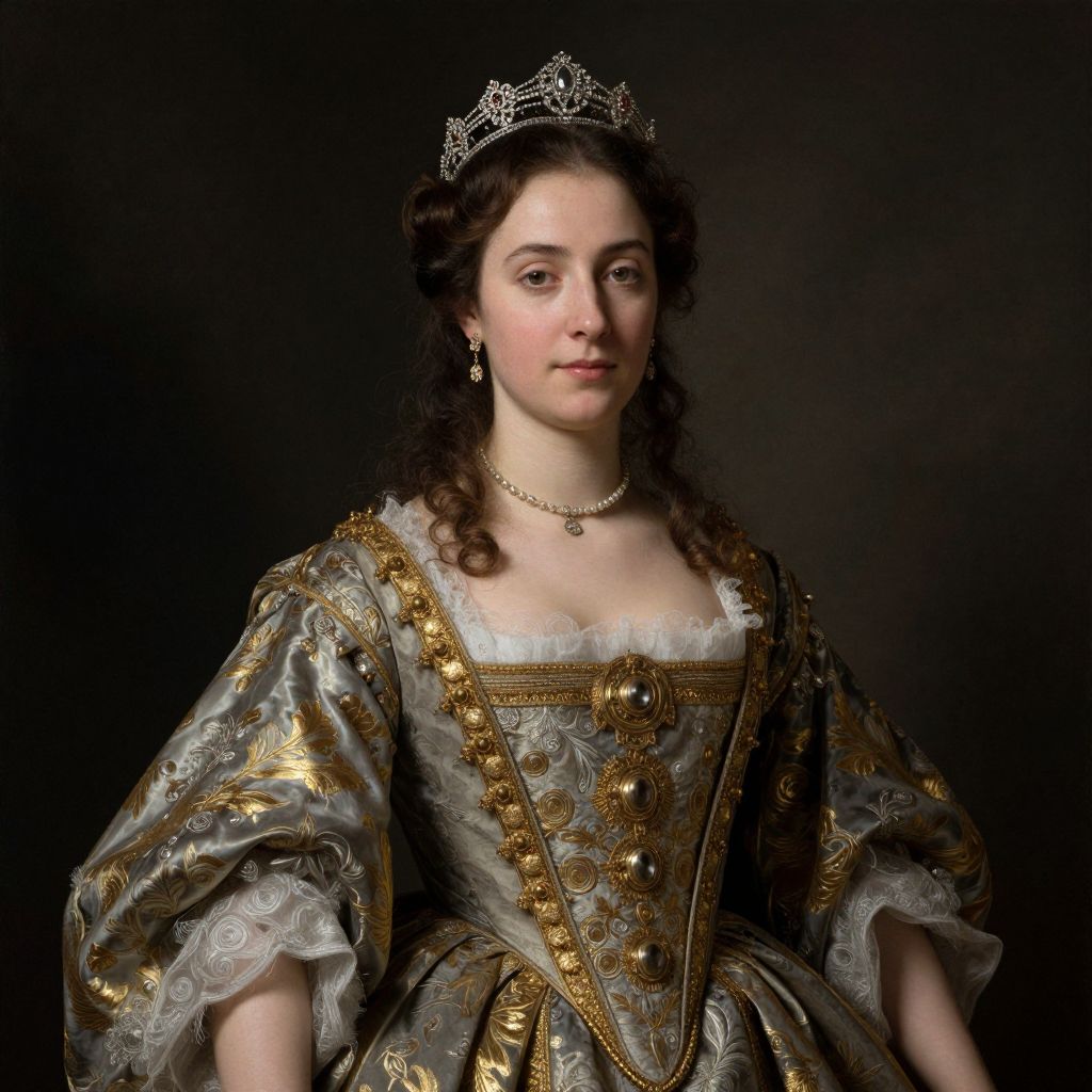 Photograph of a young Caucasian woman with pale skin and dark, curly hair, wearing an ornate, silver satin dress adorned with gold embroidery and multicolored gemstones. She has a modest bust and is crowned with a delicate, jeweled tiara. Her expression is calm and composed. The dark background highlights her regal attire, which features puffed sleeves and a square neckline trimmed with lace. The dress's intricate details and the woman's poised demeanor suggest a royal or aristocratic status. The lighting emphasizes her face and the texture of her dress.