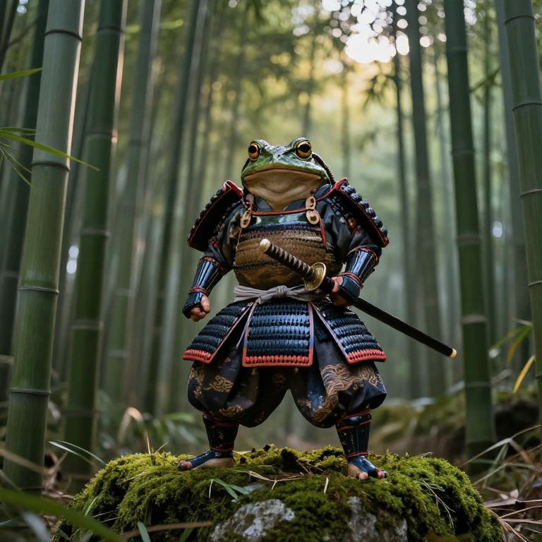 Japanese frog samurai standing on a mossy rock in a serene bamboo forest, wearing traditional samurai armor with intricate patterns, katana in hand, detailed scales, intense eyes, dawn light filtering through trees, mystical and atmospheric setting