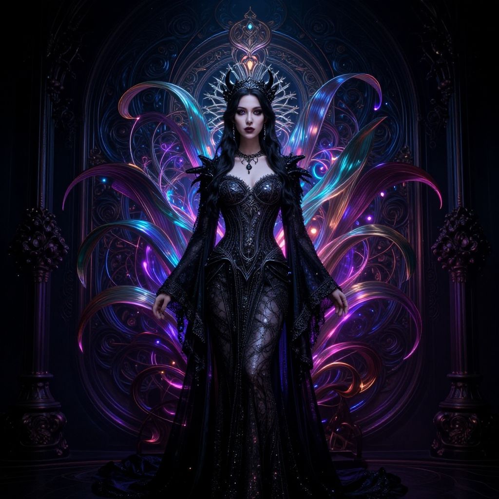 A digital artwork depicts a dark-haired woman in a tight, black spiderweb-patterned suit, sitting on an ornate, golden throne with blue velvet cushions. She has pale skin, red lips, and piercing eyes, with a glowing white spider emblem on her chest. Her black gloves and thigh-high boots add to her menacing appearance. Above her head, a bright, glowing spiderweb is visible, with sparkling bubbles floating in the dark, misty background. The throne is set against tall, arched pillars, adding a Gothic atmosphere to the scene. The overall style is dark fantasy with a cyberpunk influence.