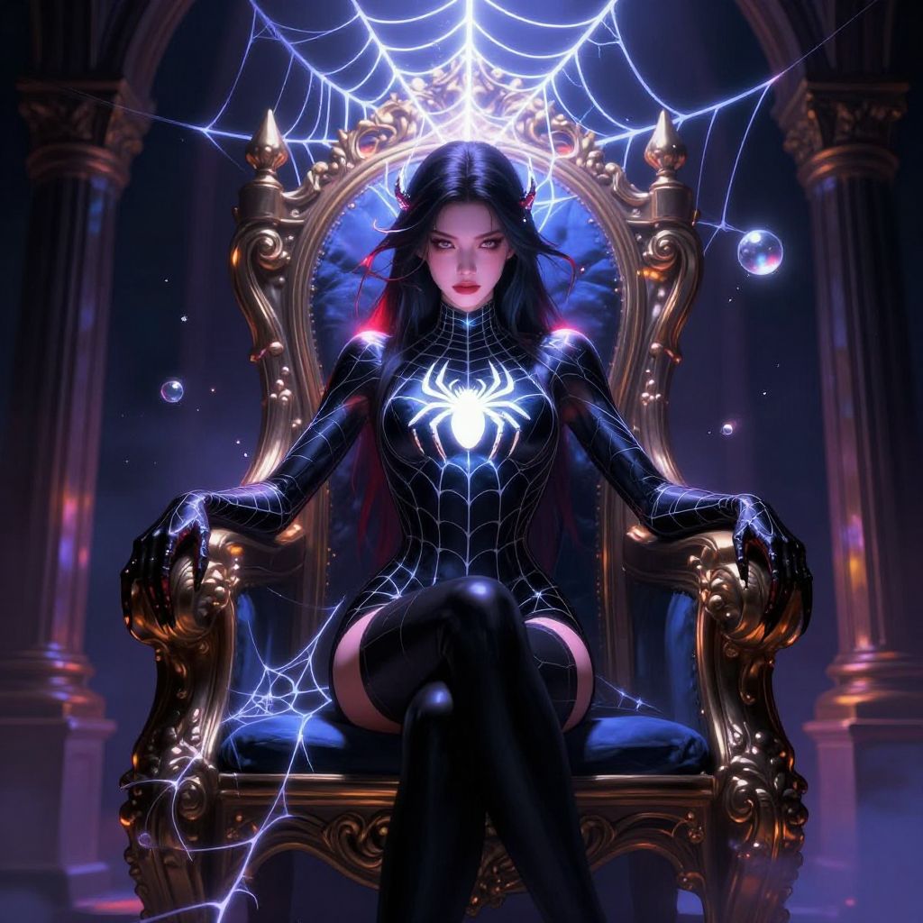 Digital art: Dark-haired woman in black spider-web suit, glowing spider emblem, sitting on ornate golden chair, surrounded by web and bubbles.