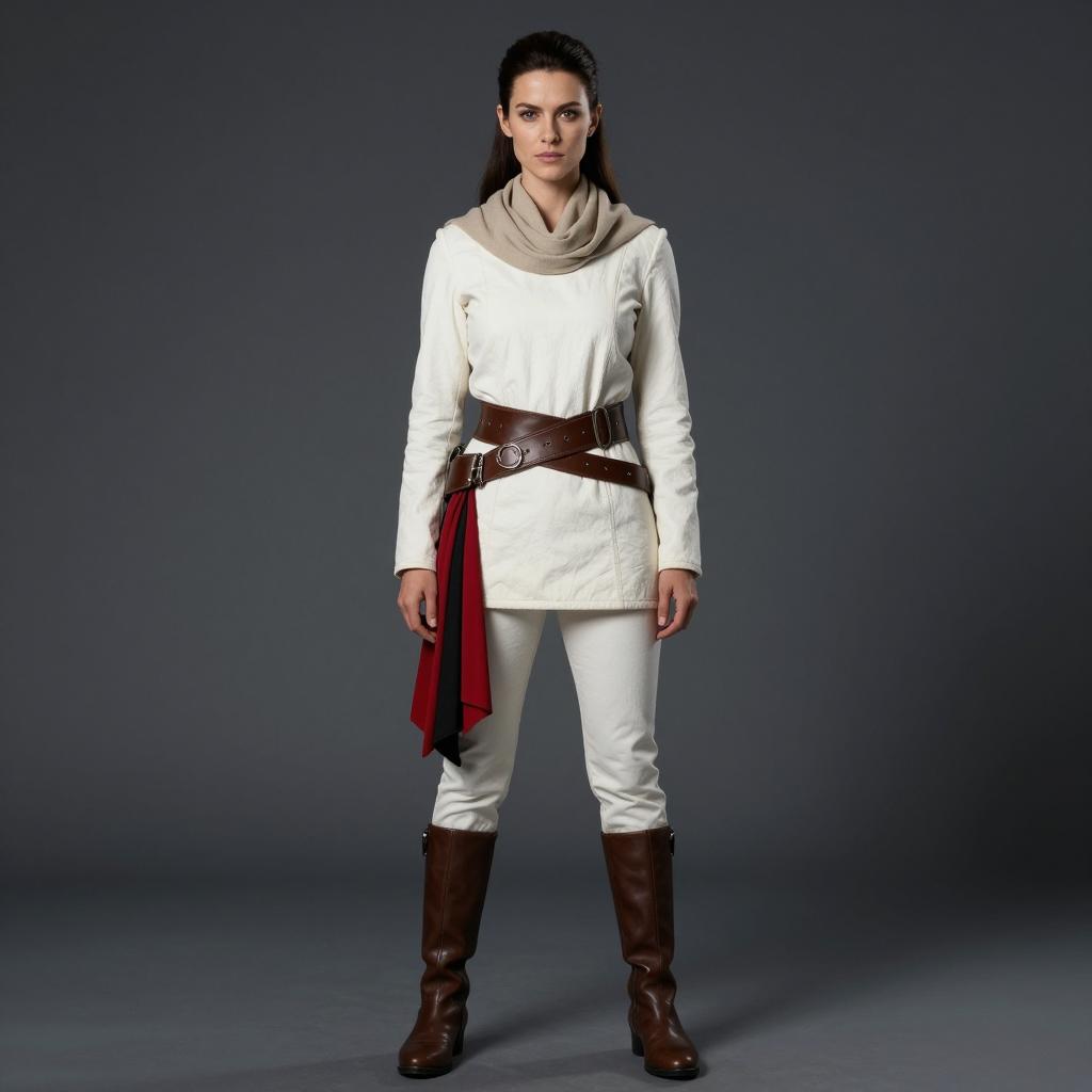 Steampunk skirt, steampunk woman, standing, front view, photograph, realistic style, brown leather vest with brass buttons and buckles, white long-sleeve shirt, brown pleated skirt, black fingerless gloves, red braided hair, aviator goggles on head, serious expression, gray smoky background, detailed ures, vintage Victorian attire, intricate leatherwork, historical military influence, fantasy aesthetics, realistic lighting, full body shot, no accessories on hands