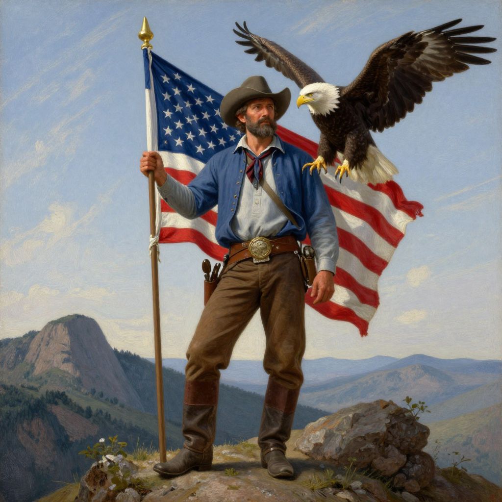 A heroic American mountain man stands on a mountain with an American flag and a bald eagle, wearing a cowboy hat and boots, in a photorealistic oil painting with classical proportions and Rembrandt lighting.
