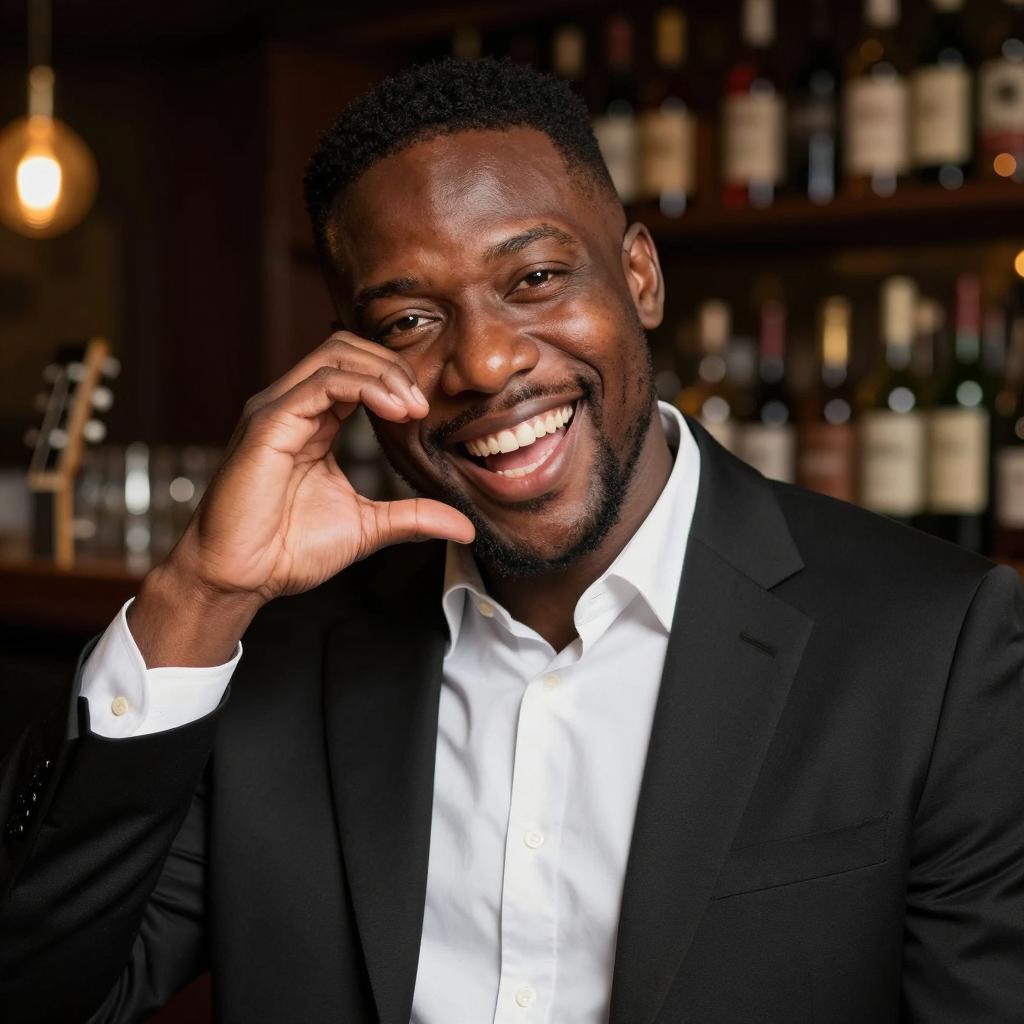 Portrait of a stylish African-American man with dark skin wearing large black sunglasses and an orange shimmering puffy-sleeve shirt. He accessorizes with a large silver necklace, multiple rings, and a silver wristwatch. The man rests his chin on his hand, looking thoughtfully to the side. The background shows a warmly lit bar setting with blurred figures of people, bottles, and glasses, creating a sophisticated atmosphere.