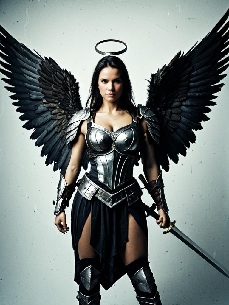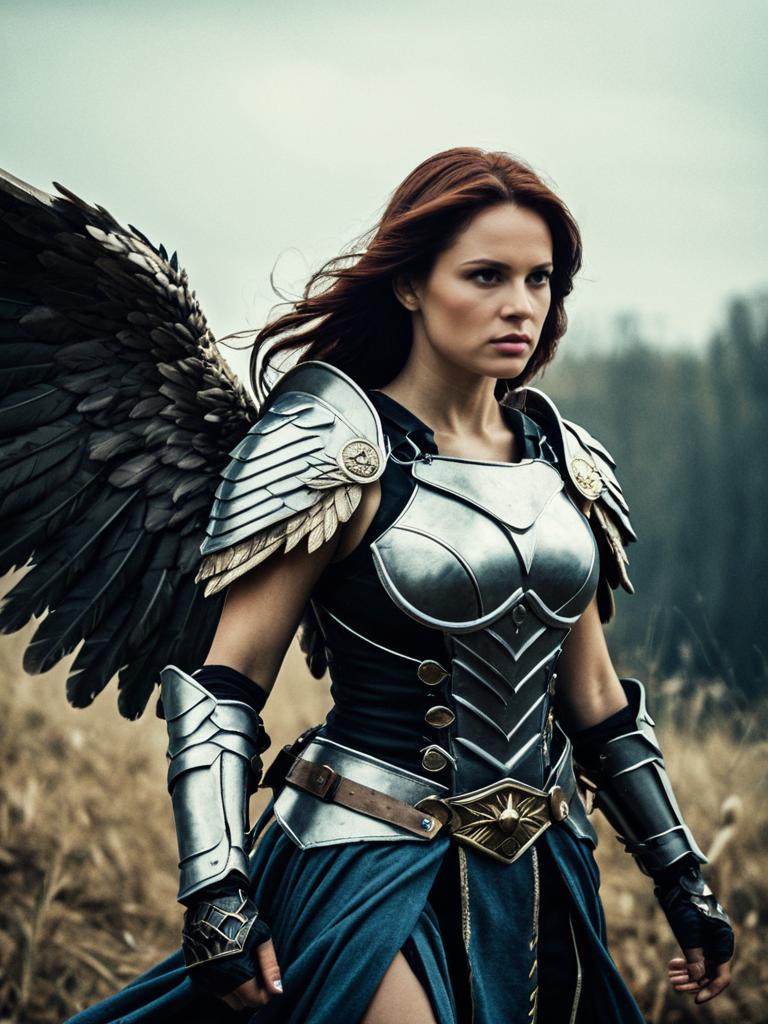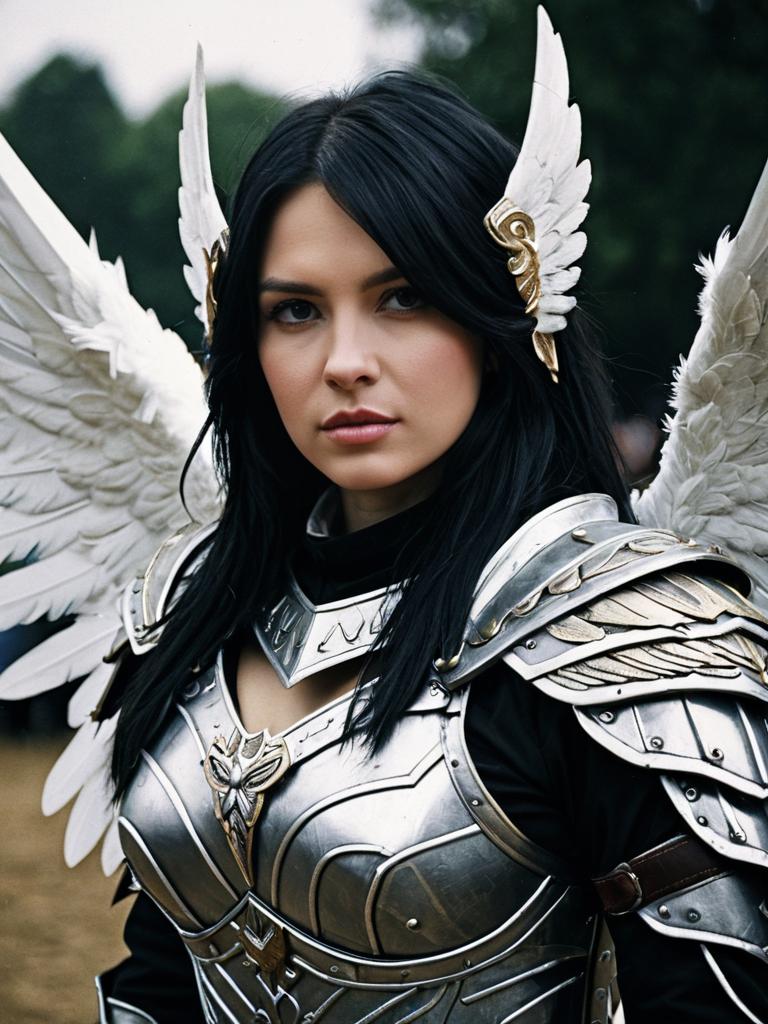 Woman in Warrior Angel Costume, photorealistic fantasy cosplay portrait, cinematic realism