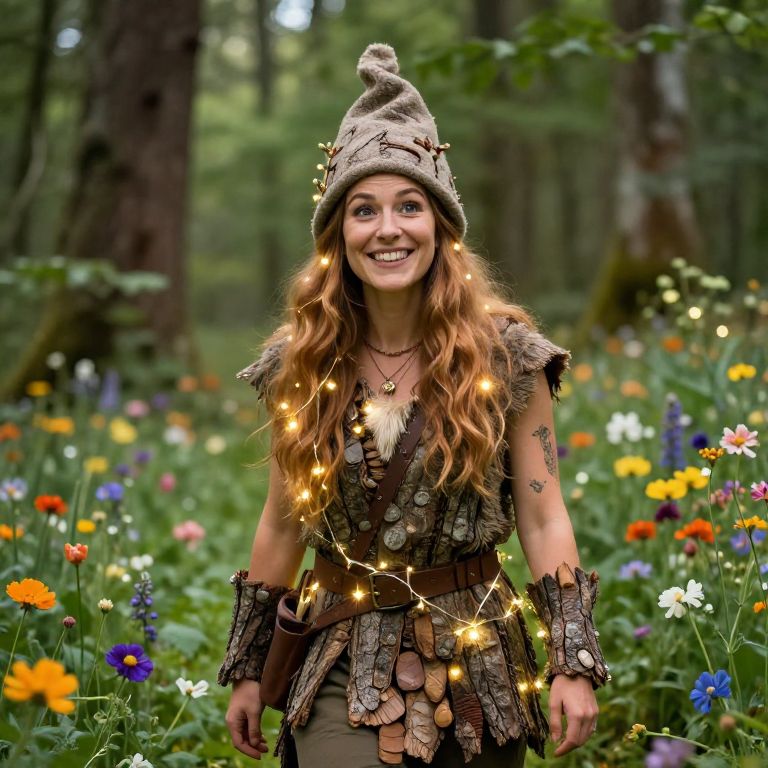 Photograph of a smiling young woman with long, wavy, red hair wearing a brown, fuzzy, pointed hat adorned with a small flower. She is dressed in a brown, leafy, fantasy-style outfit with a V-neck, decorated with coins and small, glowing fairy lights. Her arms are also covered in leafy fabric. She stands in a lush, green forest meadow filled with colorful wildflowers, including orange, yellow, and purple blooms. The background is blurred, with tall trees and dense foliage. The overall scene has a whimsical, magical forest vibe.