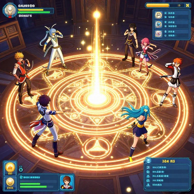 This digital anime-style illustration features a group of seven characters, including both male and female, engaged in a magical battle on a glowing circular rune platform. The central character, a blue-haired girl in a black and white outfit, is surrounded by others wielding swords and magical staffs. The background is dark, highlighting the bright, golden runes beneath them. Interface elements, such as health bars and status menus, are present in the corners, indicating a video game setting. The characters display various hair colors and outfits, adding to the dynamic and colorful composition.