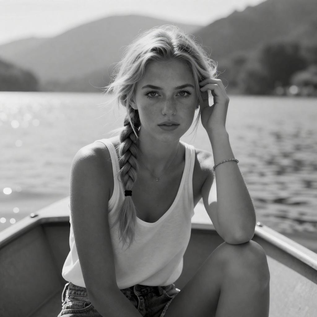 Black-and-white photograph of a young woman with blonde hair in a braid, sitting in a boat. She wears a sleeveless top and a bracelet on her right wrist, with her left hand touching her hair. The background shows a blurred, sunlit lake and mountains. Her intense gaze is directed at the camera.