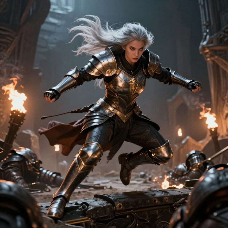 Digital artwork depicting a fierce, white-haired woman in shiny, silver armor leaping through a dark, medieval-style dungeon. Her armor is intricately detailed with gold accents, and she has a determined expression. Her long hair flows wildly as she moves. The background is dimly lit, with torches casting a warm, flickering light. Fallen, silver-armored soldiers are scattered on the stone floor around her. The scene is dynamic and action-packed, with a dramatic contrast between the dark, shadowy environment and the bright, reflective armor. The image has a realistic, fantasy art style.