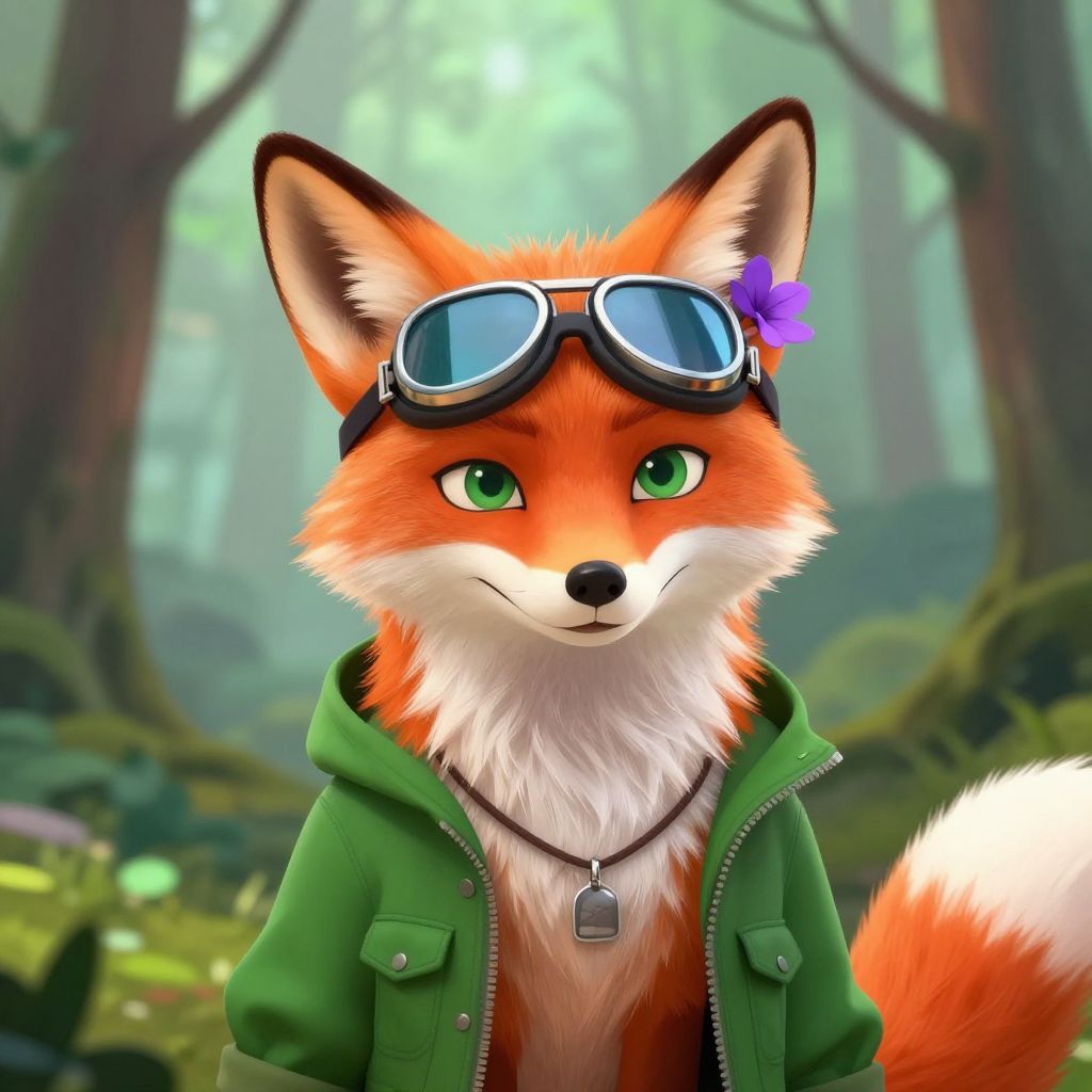 Digital illustration of an anthropomorphic fox with orange and white fur, wearing a green jacket, aviator goggles, and necklaces. The fox has green eyes and a purple flower behind its ear, set against a backdrop of a misty forest with tall trees and soft greenery.
