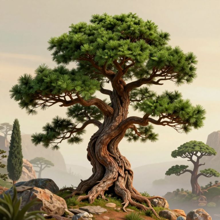 The image showcases a fantastical cypress tree, rendered in a highly detailed and realistic style reminiscent of Dr. Seuss and Pixar. The tree stands majestically on a rocky outcrop, its twisted trunk and sprawling branches reaching out to the sky. The bark is rough and textured, with a warm, earthy tone that contrasts beautifully with the vibrant green of the foliage. Surrounding the base of the tree are various rocks and boulders, adding to the rugged, natural setting. In the background, a misty landscape unfolds, with soft, muted colors that enhance the mystical atmosphere. To the right of the tree, there are smaller, stylized versions of the same tree, each with its own unique twist and branch configuration, creating a sense of depth and scale. The overall composition is balanced, with the tree as the central focus, and the surrounding elements carefully arranged to complement its grandeur. The image is a testament to the artist's skill in capturing the essence of a fantastical cypress tree in a hyper-realistic and detailed manner.