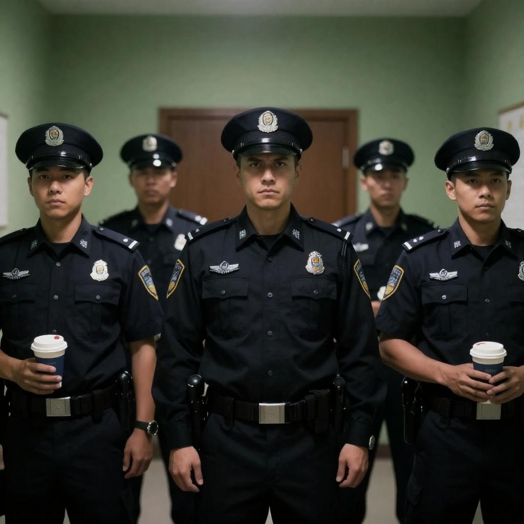 Photograph of six male police officers in dark uniforms and hats, standing in a dimly lit green-walled room. Central officer with short brown hair, intense expression, black jacket with police badge, and badge on left shoulder. Other officers have neutral expressions, some holding coffee cups. Wooden door in background. Officers to left and right of central figure, with another officer slightly behind central figure.