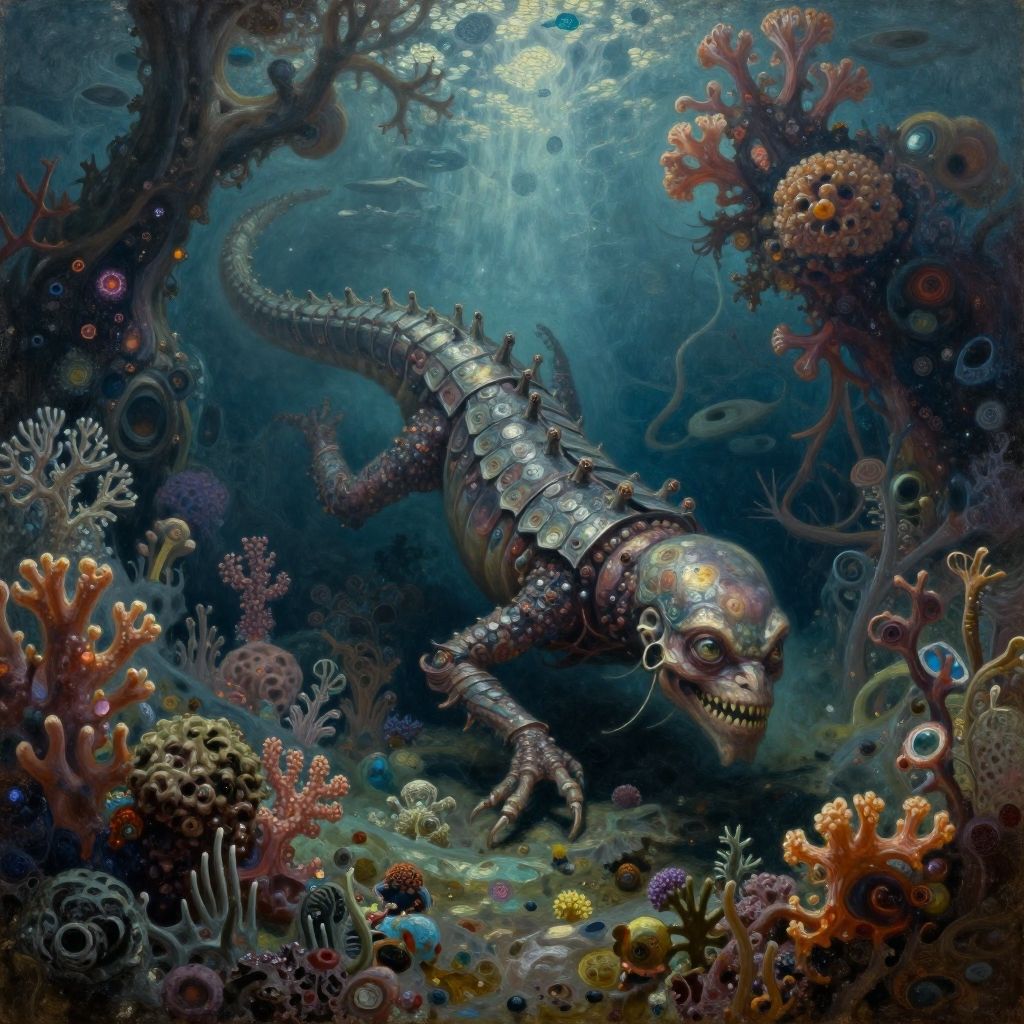 A vivid, digital painting of a fantastical, armored lizard-like creature swimming through a colorful underwater coral reef. The creature has a metallic, scaly texture with glowing yellow eyes and sharp teeth. Surrounding it are vibrant corals in shades of pink, orange, and purple, and various sea anemones. Sunlight filters through the water, illuminating the scene. The background features swirling, dark aquatic plants and bubbles, adding depth and motion to the underwater environment. The overall style is highly detailed and fantastical, with a surreal, otherworldly feel.