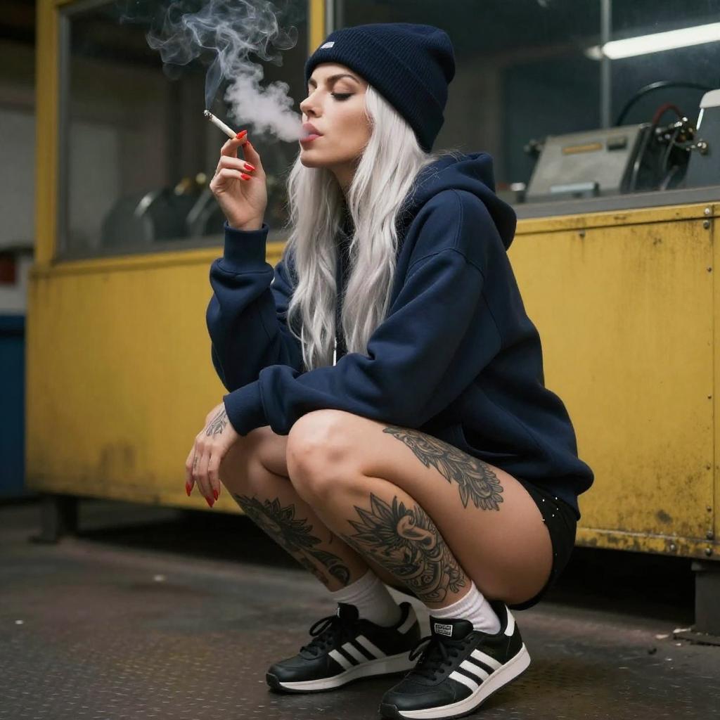Photograph of a tattooed woman with long white hair, squatting in a dimly lit industrial setting. She wears a navy hoodie, black and white Adidas sneakers, and a navy beanie. She exhales smoke from a cigarette, with red-painted nails visible. Her right leg, covered in intricate black tattoos, is prominently displayed. The background includes yellow machinery and a metal floor.