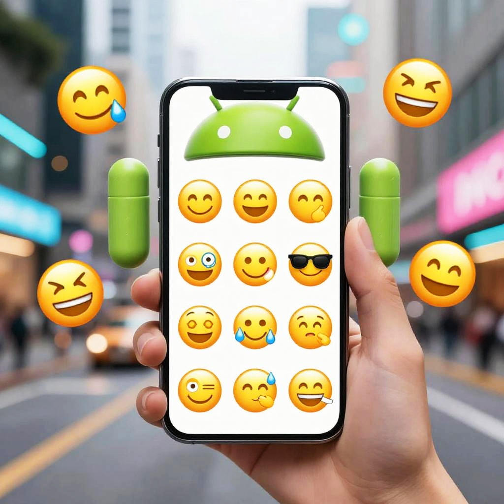 Create emoji from photo android: a creative depiction of a user holding an Android phone that transforms selfies into custom emojis with animated expressions, surrounded by floating emoji icons in a vibrant, futuristic urban environment, high detail.