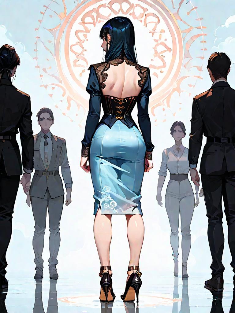 Illustration of a full-body woman in a dark fantasy setting wearing a corset-inspired sheath dress with a structured bodice and pencil skirt silhouette. The dress features deep burgundy satin fabric, lace-up back details, delicate floral embroidery, and a matching bolero jacket made from sheer organza with black lace trim. She wears black patent leather stiletto heels with ankle straps and gold accents. The scene is set at nighttime with fog and night mist, with four other figures dressed in contrasting attire standing around her.