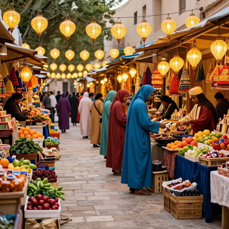 Photograph of a vibrant outdoor market with string lights, colorful produce, and women in traditional robes shopping along a cobblestone path.