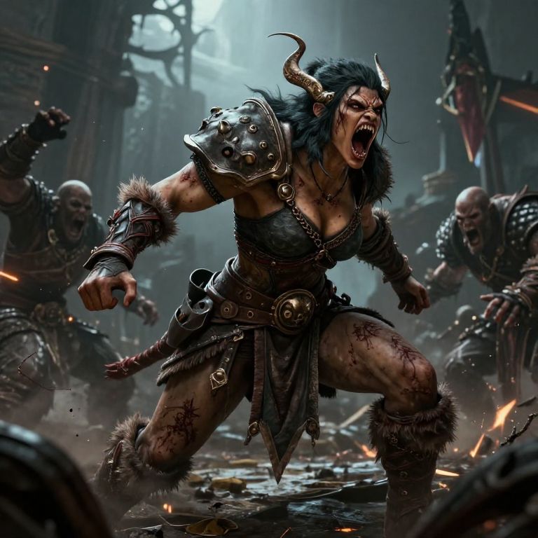 Diablo 4 Barbarian female roaring battle cry, surrounded by defeated enemies, dynamic action pose, dark and gritty style, detailed muscle definition and scars