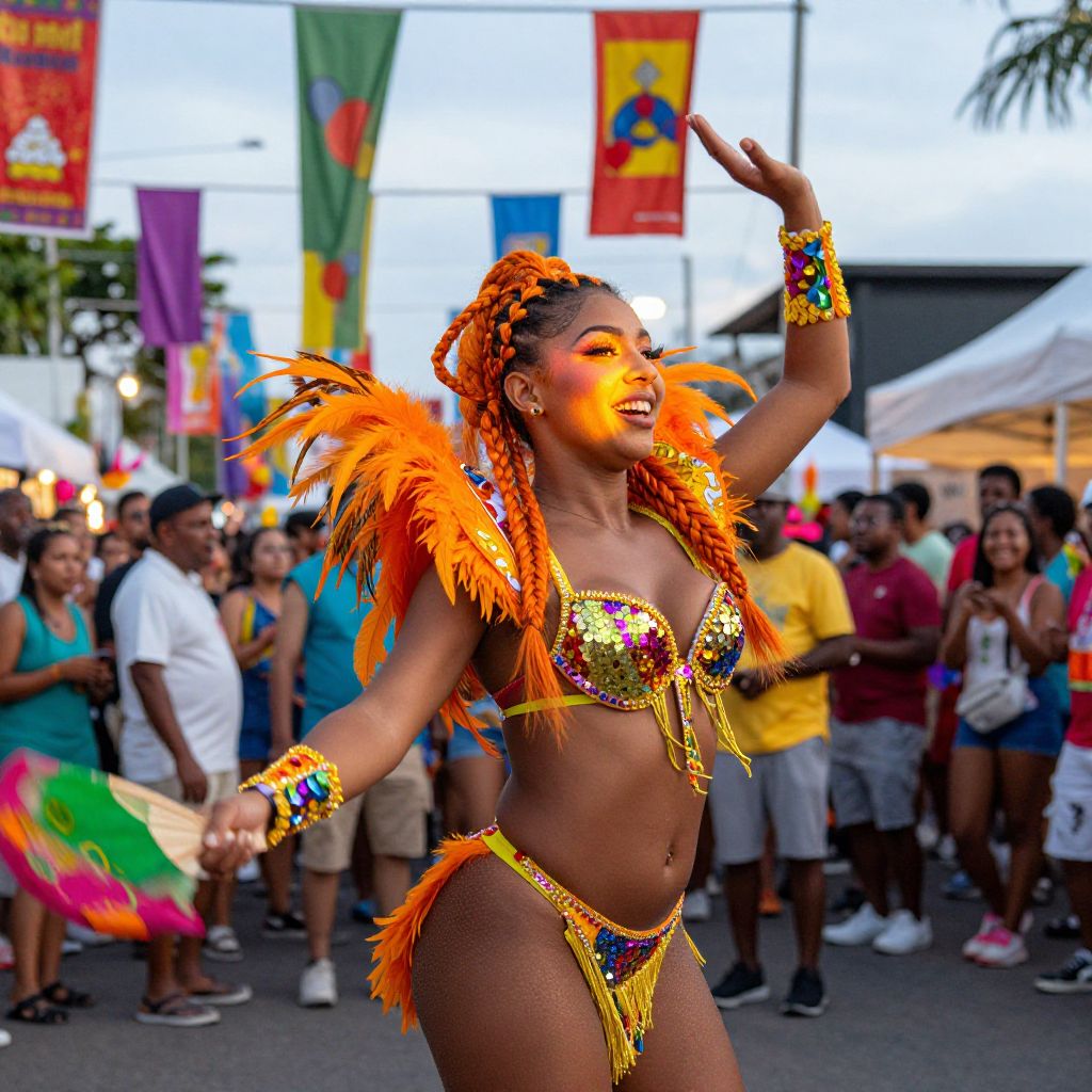 Photograph of a vibrant Black woman dancing in an orange feathered bikini at a colorful outdoor festival, surrounded by cheering spectators.