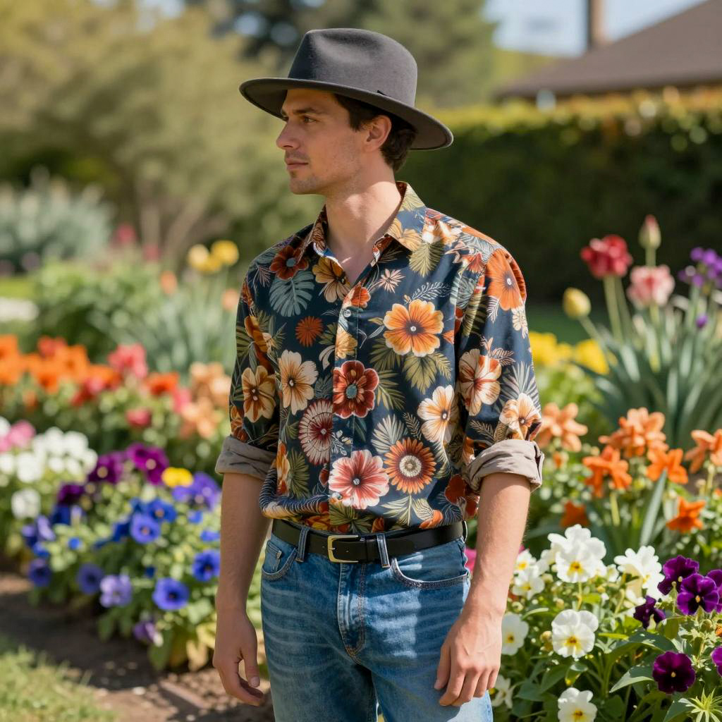 Young man with dark hair, wearing a colorful floral short-sleeve shirt over a white tank top, red pants, and a black belt, standing with arms outstretched and mouth open mid-yell. The background includes a red car, green foliage, and a blue gas canister in a daylight outdoor setting.