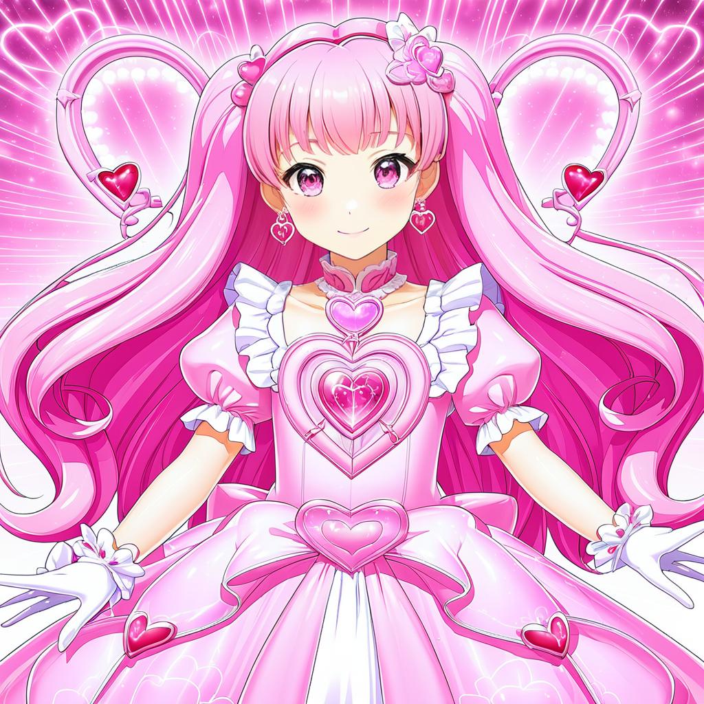 Cure grace, healin' good precure, 1girl, pink eyes, pink hair, long hair, very long hair, heart hair ornament, hair flower, white gloves, pink dress, pink choker, puffy short sleeves, earrings, magical girl, magical girl, by artist yamashita takahiro, anime