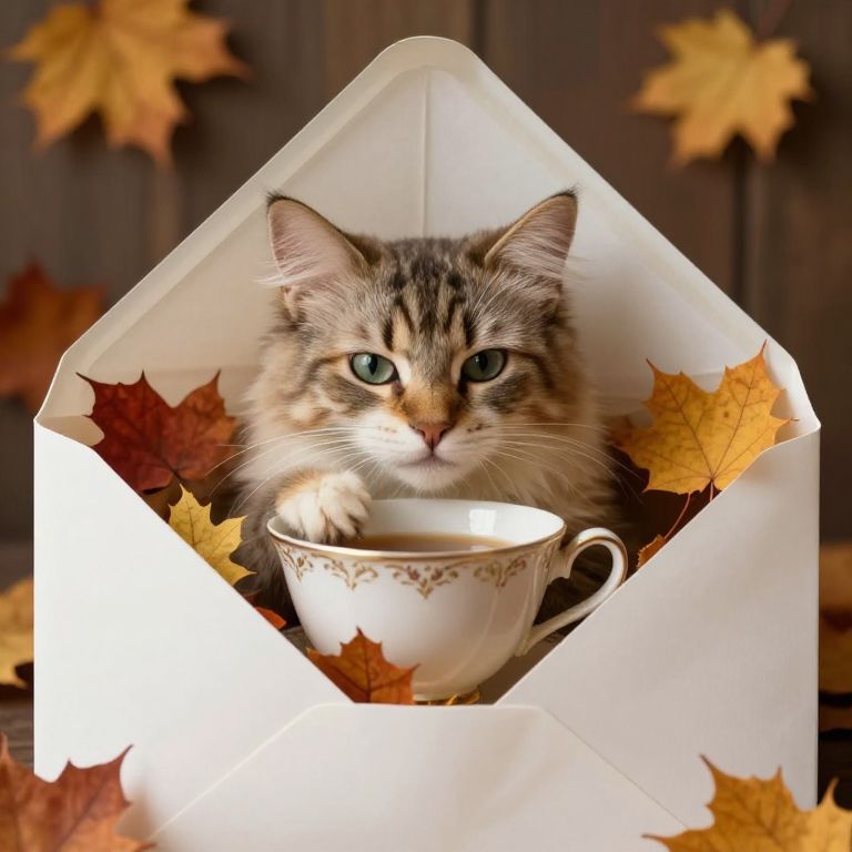 Adorable tabby kitten with green eyes inside a white cup nestled in an envelope, surrounded by autumn leaves, photograph.