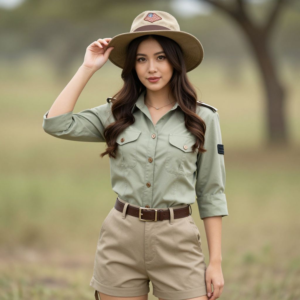 Safari Attire Woman Costume, woman in a safari shirt and hat posing for a picture
