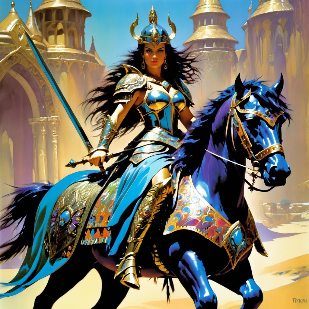 A fierce warrior queen with ornate armor and a majestic steed, colorful and cinematic style by Frank Frazetta, Julie Bell, Brian Froud.