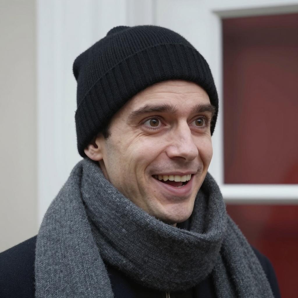 Photograph of a man with short brown hair, light skin, drinking from a blue and white plastic milk bottle. He is wearing a red jacket, head tilted back, mouth open, bottle near his lips. His eyes are slightly squinted, looking upward. The background is dark. His right hand holds the bottle.