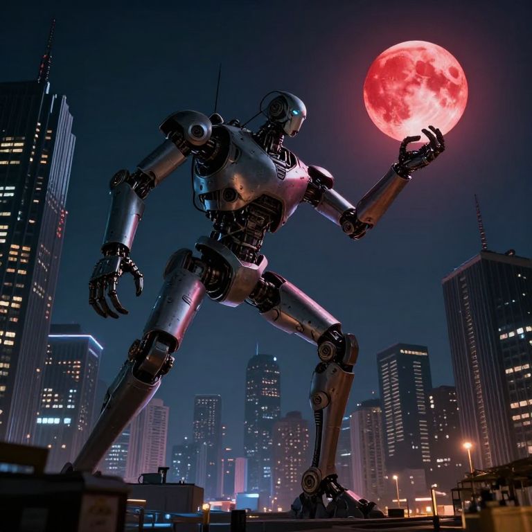 Photograph of a futuristic, robotic figure standing in a cityscape at night. The robot, with metallic silver joints and limbs, is positioned in a dynamic stance, holding a glowing red moon in its right hand. The city background features tall skyscrapers with illuminated windows, creating a contrast against the dark blue night sky. Neon lights and street lamps add a vibrant glow to the scene. The robotic figure is illuminated by the red moon, casting a dramatic light on its metallic surface. The overall style is cyberpunk, emphasizing futuristic and sci-fi elements.