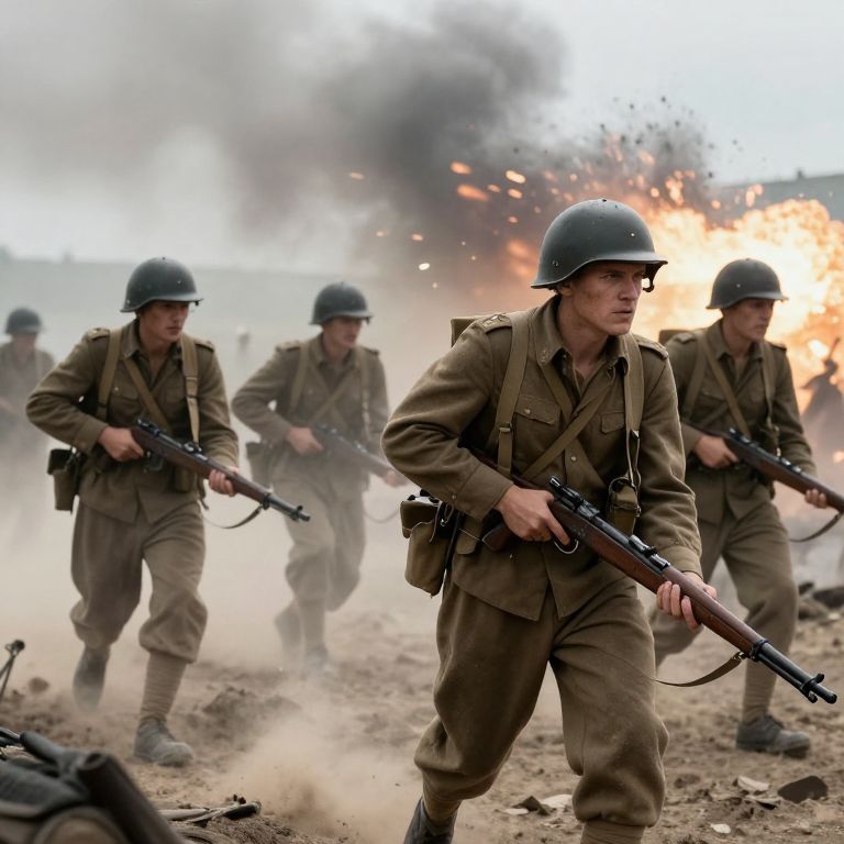 Soldiers in historical WWII uniforms advancing through a smoky battlefield, vintage rifles and helmets, explosions and dust clouds creating dramatic chaos, realistic facial expressions showing determination, muted color palette with gritty textures.