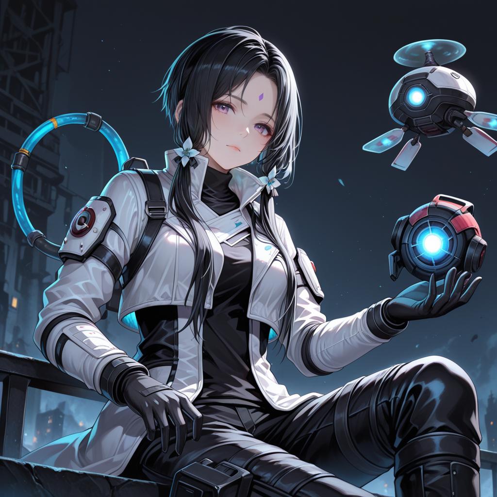Digital art of a futuristic young male hacker from Apex Legends. He has black parted hair, black eyes, and wears a white jacket with black gloves, pants, and shirt. He holds a glowing, high-tech drone in his hand. The background depicts a dark, cyberpunk cityscape at night, emphasizing a high-tech and mysterious atmosphere.