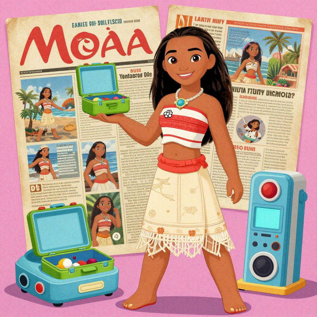 This digital illustration depicts a smiling young girl with tan skin and long black hair, wearing a red and white striped top with a blue pendant, and a white, fringed skirt. She holds a green toy chest with colorful balls. Behind her are three colorful newspapers featuring her in beach and tropical settings. To her left is a blue toy car with a green chest, and to her right is a blue and yellow portable CD player. The background is pink, and the overall style is vibrant and cartoonish.