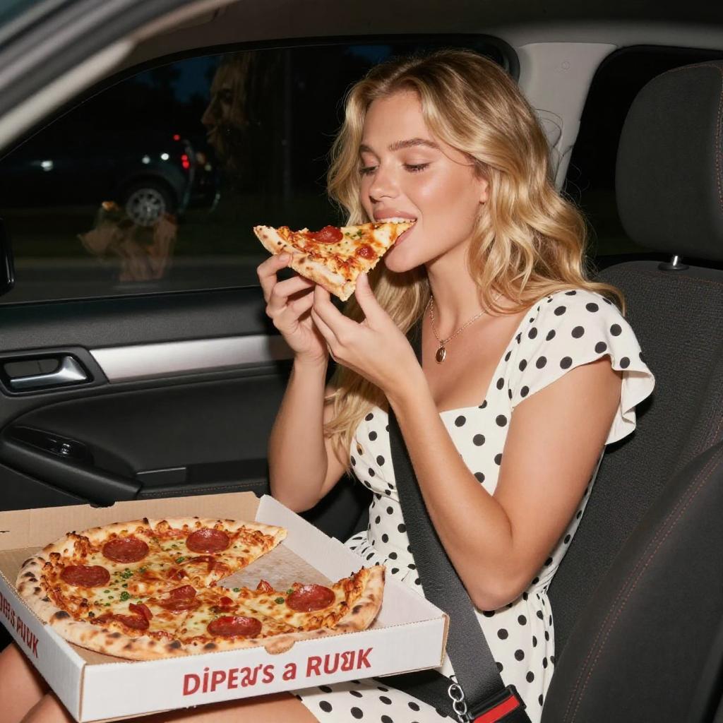 A blonde woman with long hair, wearing a white sleeveless top and high-waisted blue jeans, sits in a red leather booth, holding a slice of pizza with green peppers. A large pizza with various toppings is on the table in front of her, and a can of soda is on the right. Sunlight streams through a window behind her.