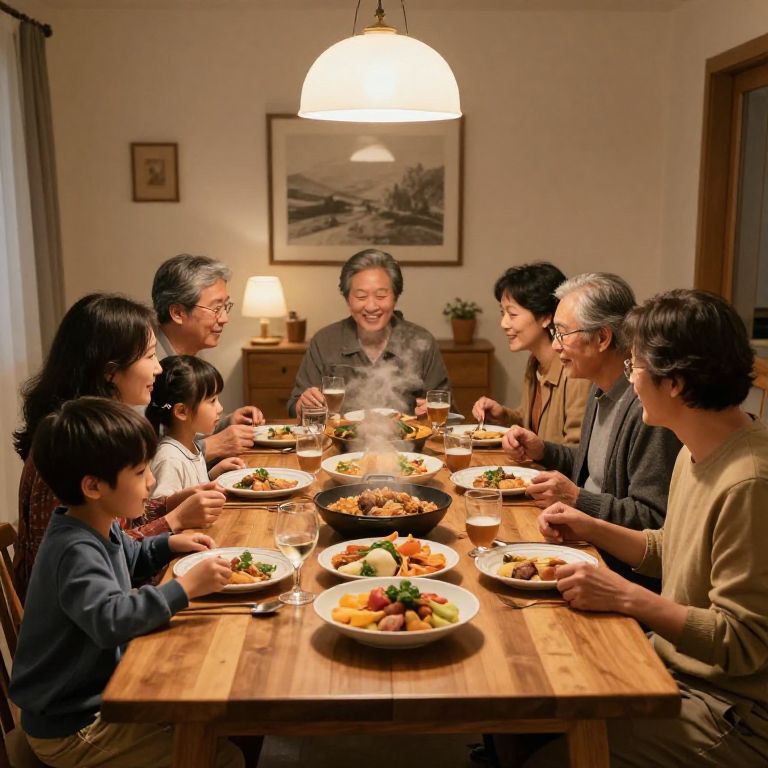 Photograph of a happy Asian family of eight sitting around a wooden dining table, sharing a meal, with warm lighting and homely decor.