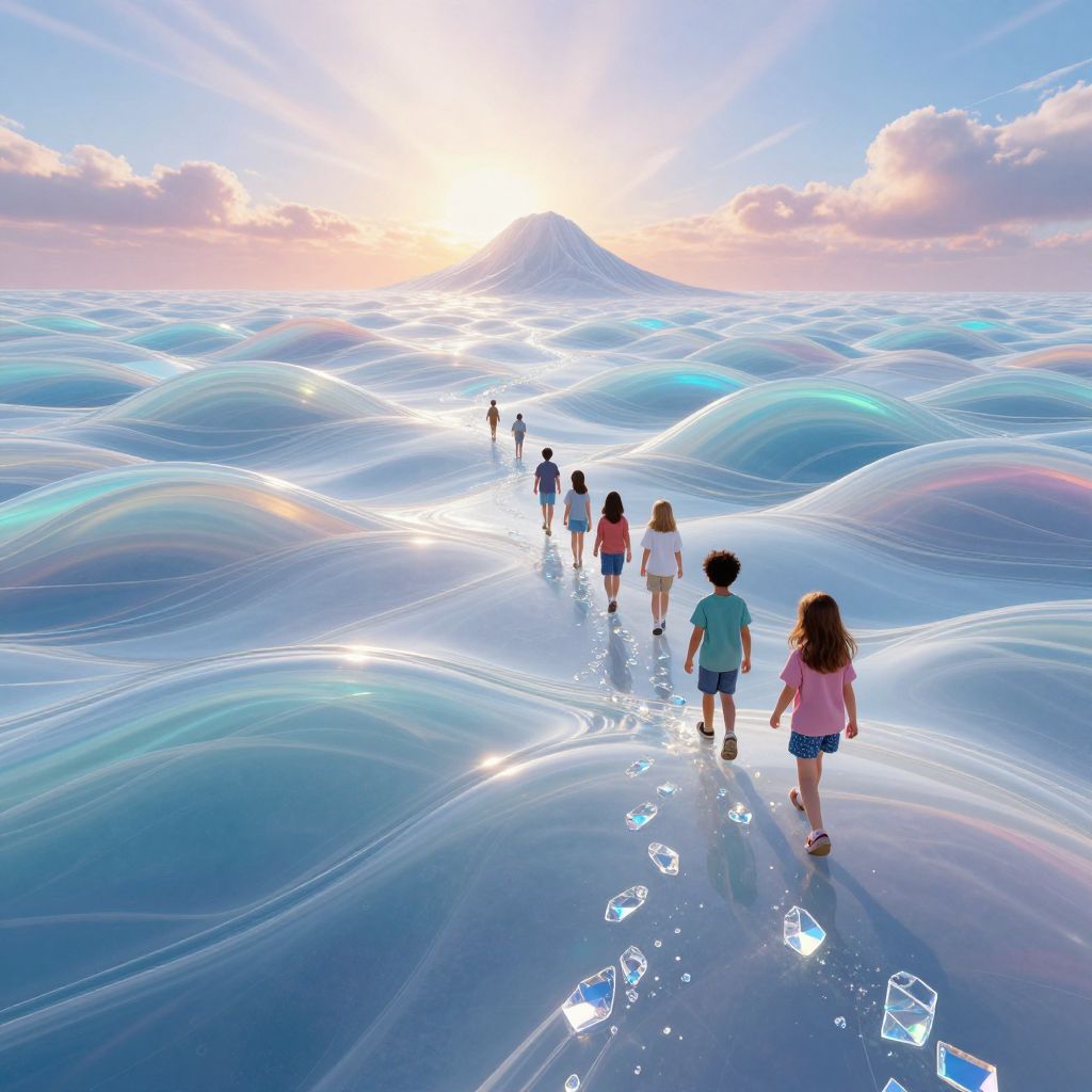 In a surreal digital artwork rendered in vibrant hues, children traverse a fantastical landscape of rolling, translucent waves composed of liquid glass, their footprints crystallizing into shimmering trails as they journey toward a distant peak under a radiant sky.