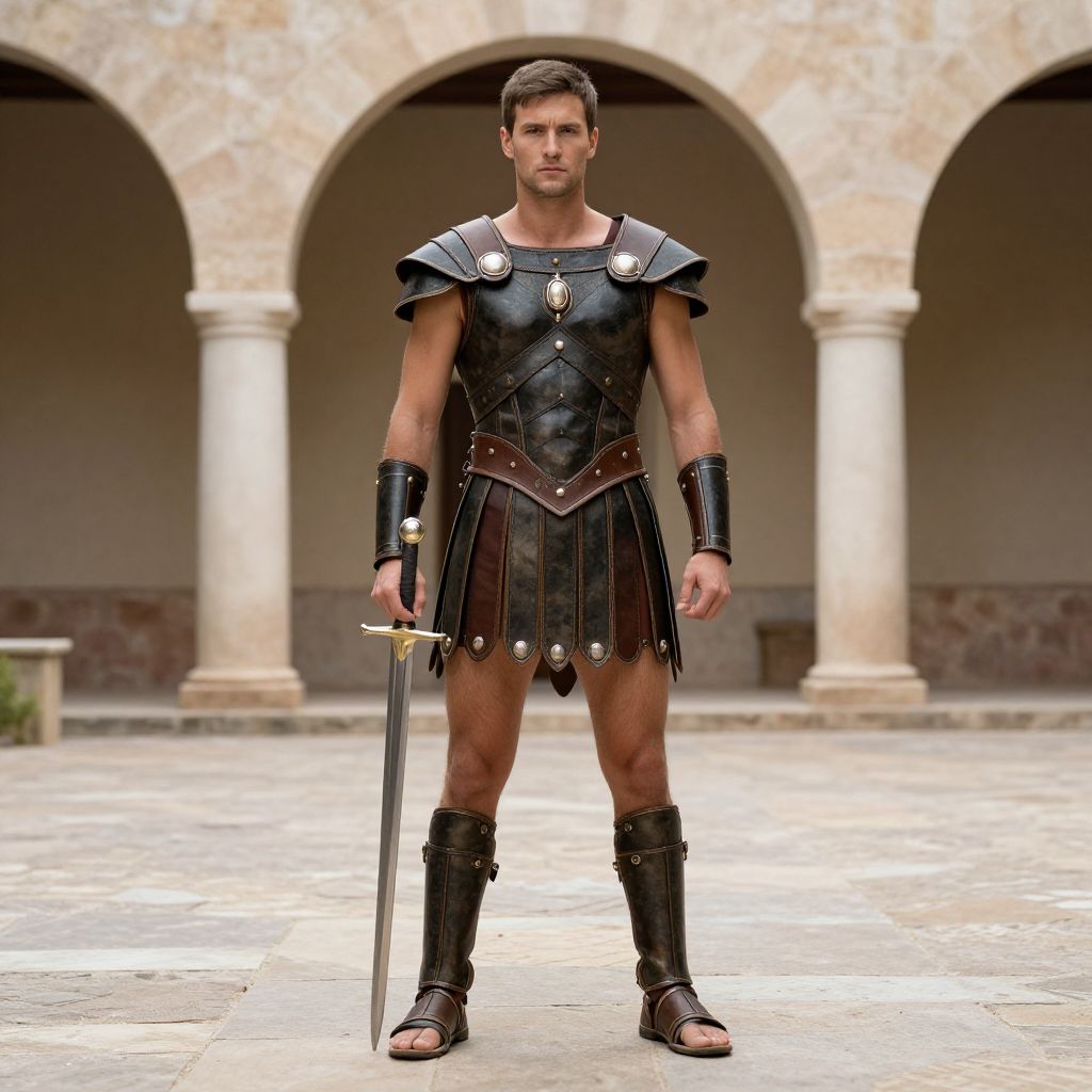 Man gladiator sandals fancy dress, man in armor standing in a courtyard with a sword