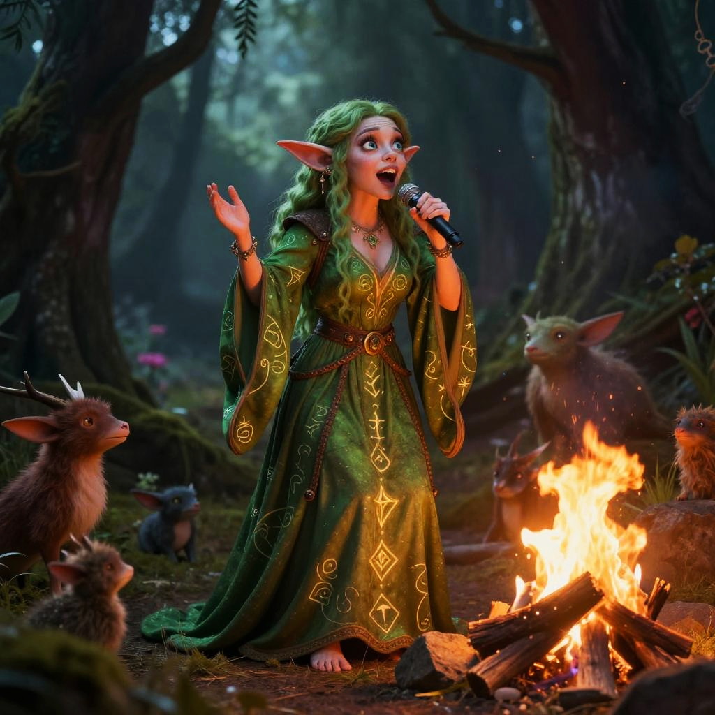 Sexy female goblin bard singing by campfire, flowing green dress with magical runes, playful eyes, surrounded by enchanted forest creatures, warm glowing light, fantasy realism