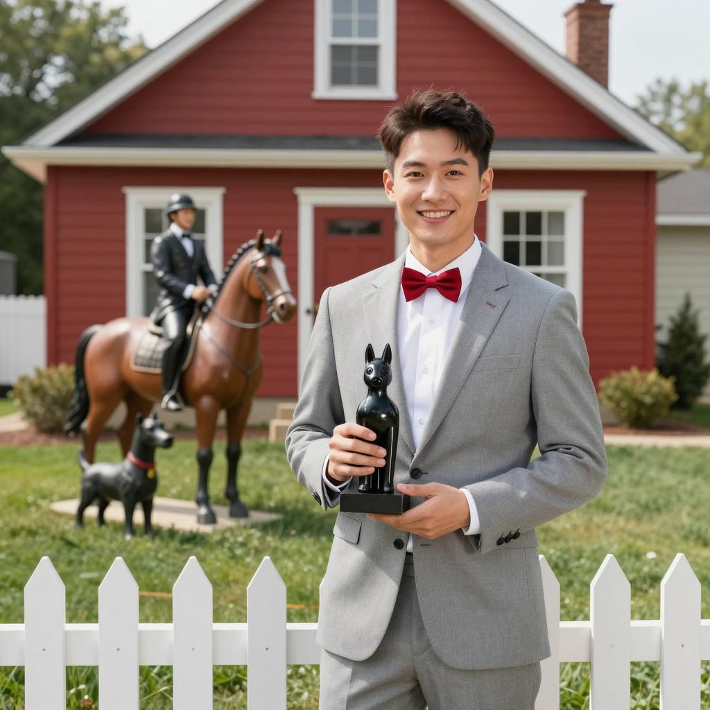 A young Asian man wearing a gray suit with a white shirt and red bow tie is smiling while holding a black dog sculpture. He stands in front of a white picket fence with a red house with white trim behind him. The yard features two horse statues, one ridden by a figure dressed in formal riding attire, and a smaller dog statue. The scene is set on a sunny day with green grass.