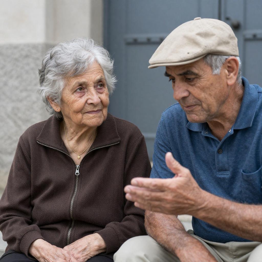 Old woman with white headscarf, light beige cardigan, and white shirt sitting in car driver's seat, looking surprised. Green hillside and overcast sky visible through car window. Car interior includes dashboard and black seatbelt. One person.
