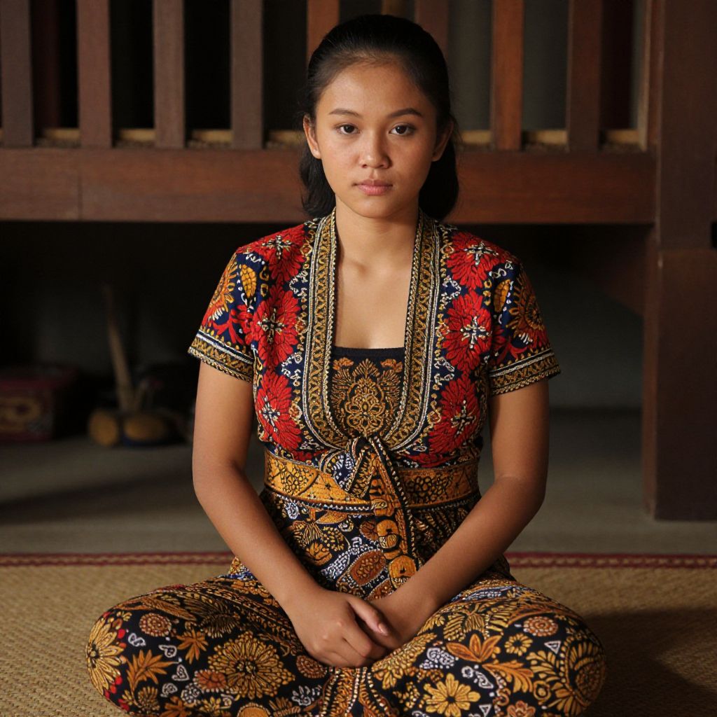 A detailed close-up photograph of an Indonesian batik woman in a traditional pose, sitting cross-legged on a woven mat in a rural home, wearing a hand-embroidered batik outfit with bold red, indigo, and gold patterns, her face calm and focused, soft brown skin, natural makeup, with a subtle expression of pride, warm indoor lighting with traditional wooden beams in the background.. The woman has big tits and cute face