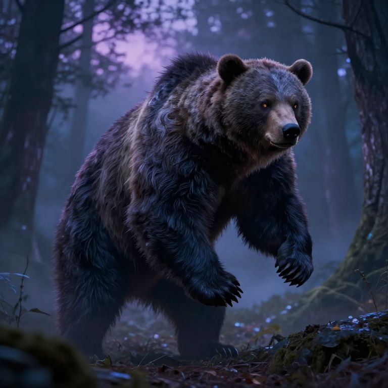 Photorealistic digital artwork of a large, muscular brown bear standing in a misty, dark forest. The bear, with dense, dark brown fur and glowing amber eyes, stands on all fours with its right front paw slightly raised. The background features tall, blurry trees with a purplish-blue mist, creating a mysterious, eerie atmosphere. The forest floor is covered in moss, leaves, and small twigs, adding texture to the scene. The bear's fur appears thick and slightly wet, reflecting the ambient light. The image captures a sense of power and wilderness.